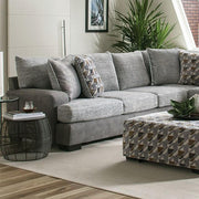 A gorgeous sectional features two gray fabric styles while accent pillows share the same unique pattern with the ottoman.