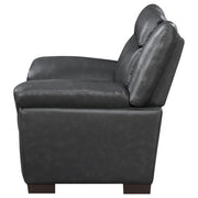 Bring modern comfort and sophistication to your seating area with this contemporary armchair. Upholstered in smooth grey leatherette with detailed stitching, it offers a clean, refined look. Generously padded seating and plush pillow-top arms provide exceptional comfort, while the high back delivers excellent support. Its sturdy wooden frame and dark brown block-style legs add lasting stability and a touch of contrast. Compact and stylish, this chair enhances any living room or lounge space with its modern design and inviting appeal._x005F_x000D_ Key Features: • Accent chair upholstered in soft grey leatherette with refined stitched detailing for a sleek finish • Plush cushioned seat and pillow-top arms create a cozy, supportive seating experience • High backrest offers exceptional comfort and ergonomic support for everyday lounging • Dark brown block-style legs provide sturdy stability and a modern contrasting accent • Durable wooden frame construction ensures long-lasting strength and reliability • Compact profile fits easily into living rooms, bedrooms, or office seating areas