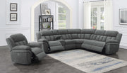 Designed for flexibility and comfort, this six-piece modular power sectional transforms your living space into the ultimate entertainment hub. Upholstered in soft charcoal performance chenille, it features three power reclining seats with wall-hugging mechanisms to maximize floor space. A lift-top console adds hidden storage, built-in power outlets with USB ports, and two stainless steel cup holders with removable inserts. Supportive pocket coil seating and a cool gel memory foam topper ensure long-lasting comfort._x005F_x000D_ Key Features: • Six-piece modular power sectional in charcoal performance chenille upholstery • Three power reclining seats with wall-hugging mechanism for space efficiency • Lift-top console with hidden storage, two cup holders, and integrated outlets • Supportive pocket coil seating ensures comfort and long-lasting durability • Includes one-inch cool gel memory foam topper for enhanced seating support • Spacious design provides seating for family gatherings or entertainment areas