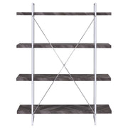 Enhance your storage and display space with this contemporary bookshelf, featuring a rustic grey herringbone finish for a modern organic touch. The sleek chrome metal frame provides durability and style, complemented by an X-shaped back support for stability. Four open shelves extend beyond the frame, creating a bold, geometric aesthetic perfect for showcasing books, décor, or collectibles. Crafted from engineered wood and metal, this shelving unit blends industrial and modern styles seamlessly, making it a stunning addition to living rooms, offices, or bedrooms. Key Features: • Four-tier bookshelf with a bold open-shelf design for a modern look • Rustic grey herringbone finish adds warmth and organic charm • Sleek chrome metal frame with X-back support enhances durability • Extended open shelves provide ample display space for books and décor • Crafted from engineered wood, MDF, and metal for long-lasting use • Ideal for home offices, living rooms, or contemporary spaces