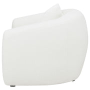 Add inviting elegance to your space with this contemporary accent chair upholstered in soft faux sheepskin boucle fabric. Its smooth curved frame and sloped armrests create a sculptural, cloud-like silhouette that enhances any modern interior. A plush seat cushion offers comfort and support, while the tight back keeps its refined shape. Finished with subtle black legs for gentle contrast, this chair includes a matching faux down accent pillow for an extra touch of coziness and sophistication._x005F_x000D_ Key Features: • Accent chair wrapped in natural faux sheepskin boucle upholstery • Curved silhouette with sloped arms adds softness and sophistication • Plush seat cushion ensures lasting comfort and modern elegance • Tight back maintains a tailored and structured contemporary look • Includes matching accent pillow with soft faux down fill for coziness • Black legs provide subtle contrast to the bright, airy upholstery