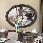 ARCADIA Rustic Natural Tone Mirror, Oval, 49"W X 37"H X 1 1/2"D, 34.1lbs. Beautiful wood inlay details create a grand statement with elegance galore. The mirror provides a stunning contrast against the rustic natural tone finish for a look that is as cozy as it is chic. Features: Transitional Style Oval Design Solid Wood, Wood Veneer, Others Rustic Natural Tone Finish
