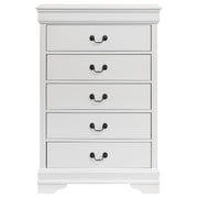 Add depth to a traditional decor scheme with this five-drawer chest. Simple and elongated, the silhouette features wood veneer and select hardwoods. Radiate classic style and sophistication with a warm cappuccino finish. Contrasting nickel bail drawer handles are a modern upgrade. The English dovetail construction provides structure that is perfect for storing linens and extra clothing. Key Features: • Five-drawer chest made from wood veneer and select hardwoods for a sturdy and durable storage solution • Features a warm cappuccino finish, adding a touch of classic style and sophistication to any room • Equipped with contrasting nickel bail drawer handles for a modern touch and easy access to stored items • Built with English dovetail construction, ensuring a robust structure for storing linens and extra clothing • Elongated silhouette design, perfect for adding depth to a traditional decor scheme