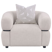 Sculptural in form yet grounded in comfort, this accent chair commands attention with its bold silhouette and plush detailing. Its wide, arched arms and thick waterfall seat are upholstered in textured fabric for a modern, tailored appeal. A distinctive solid wood waistband encircles the frame, while a down and pillow accents adds softness. With pocket coil support and refined shaping, it brings confident elegance to any living space. Key Features: • Generously scaled accent chair in beige finish with wide curved arms and sculptural silhouette • Textured fabric upholstery delivers plush softness and a modern tailored appearance • Thick waterfall bench seat features pocket coil construction for lasting support and comfort • Includes one loose accent pillow in a decorative down and feather blend for added luxury • Solid wood waistband detail elegantly wraps the exterior with sculptural refinement • Small dark brown bun feet subtly complement the profile and wood detailing above