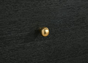 Create a dedicated space for clothing and accessory storage with this modern five-drawer chest. Its sophisticated presentation is complemented with a black finish over durable melamine surfaces, resisting damage to maintain its fresh, clean aesthetics. Each drawer front is dotted with a pair of ball knobs, offering seamless performance and a refined, glam touch of character. The chest features a rounded silhouette, softening the dark black finish, while adding to its modern appeal. Add art to its roomy top to create a truly eye-catching accent piece in your bedroom. Key Features: • A modern five-drawer chest provides plentiful bedroom storage and stylish allure • Features a black finish frame with rounded corners that create an inviting presentation • Charming petite ball knobs receive a brass finish, adding glamour and contrasting dimensionality • Made with melamine veneer that resists scratches and dents for excellent longevity and performance • Drawers feature metal extension glides for seamless performance and operation