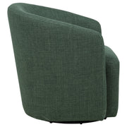 Compact comfort takes a refined turn in this swivel accent chair. Its rounded barrel back and seamless upholstery wrap the frame in sculpted softness, while a hidden swivel base adds dynamic functionality. Tailored for modern lounging, the foam-padded seat delivers support without bulk. With a space-conscious footprint and versatile silhouette, it effortlessly balances form and function in small living spaces or cozy nooks. Key Features: • Swivel accent chair with barrel-style back for modern lounge or reading nook use • Green fabric upholstery adds organic color and soft woven texture to the frame • Hidden swivel base allows smooth, quiet movement for everyday flexibility • Rounded arms and seat design enhance comfort in a sculpted contemporary form • Supportive foam cushion offers everyday softness in a space-saving size • Crafted from polyester fabric, foam padding, engineered wood, and a durable metal swivel mechanism
