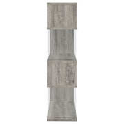 The asymmetrical zig-zag design of this contemporary bookcase creates a focal point in any room. Five open shelves in a light grey driftwood finish stack elegantly, supported by clear glass side panels that lend a modern flair to this furniture piece. Perfect for home offices, living rooms and much more, showcase anything from a book collection, decor, and other favorite items for all to see. With a flush base, this open bookcase unit rests sturdily and securely on the floor. Clean lines and a wonderful jagged design offer up style, functionality, and a stunning display. Key Features: • Zigzag bookcase design with alternating grey driftwood shelves • Clear glass side panels lend support and create a floating effect • Four open shelves offer space for books, décor, or personal items • Flush base rests flat on floors for added security and balance • Constructed from engineered wood, laminate veneer, and tempered glass • Modern sculptural format complements minimalist and contemporary rooms