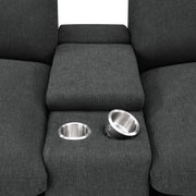 This three-seat home theater seating set combines modern convenience with plush comfort. Each power recliner offers smooth adjustability, while two center consoles feature lift-top storage and dual stainless steel cup holders. Upholstered in soft fabric, the generously padded cushions and pillow-top armrests enhance relaxation. Built for durability and long-lasting support, this seating arrangement is perfect for creating a cozy entertainment space. Key Features: • Three-seat home theater seating with smooth power reclining functionality • Soft grey fabric upholstery provides a plush, inviting seating experience • Two center consoles include lift-top storage for convenient organization • Dual stainless steel cup holders in each console for easy drink access • Pillow-top armrests and generously padded cushions for added comfort • Smooth, adjustable reclining mechanism offers personalized relaxation