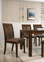 GARNETT Dining Table, 65"L X 35 3/8"W X 29 3/4"H, 88lbs. Sometimes, sophistication comes in simple packages with outstanding details. There is nothing too out-of-the-ordinary about this dining collection, besides the fact that the chairs feature a unique spine-like construction, which brings an unexpected twist to the standard back design. Seat cushions are upholstered in leatherette and the whole set is finished in a lovely, warm walnut color.
