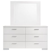 This dresser and mirror set brings streamlined function to contemporary bedrooms. The six-drawer dresser offers ample storage with smooth metal extension glides, while the mirror features a white high gloss frame that reflects light and complements the dresser’s modern silhouette. Chrome-finished handles and feet enhance the look with refined detail, making this set a practical yet stylish addition to your space. Key Features: • Modern dresser and mirror set featuring sleek, clean-lined contemporary design • Dresser finished in white high gloss for a crisp, bright, and polished appearance • Six spacious drawers offer ample room with smooth metal extension glides • Mirror includes a rectangular frame finished in matching high gloss white • Chrome-finished metal handles and feet provide refined, modern contrast • Built for durability and functionality in today’s stylish bedroom interiors