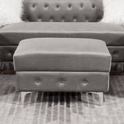 Decorator-inspired flannelette fabric and deep tufted frames combine for a seating experience that is forever inviting. The classic tuxedo design flourishes among more modern details such as the steel legs and button tufting. This ottoman fits perfectly in between the Chairses for a spectacular look.