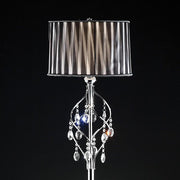 Arya Black/Chrome Floor Lamp, Hanging Crystal, 16"L X 16"W X 62 1/2"H, 18lbs. This lady crystal floor lamp features beautiful hanging crystals and a black sheer ribbon shade, which combine to create an exotic look. Features: Crystal Lamp Metal base Black Sheer Ribbon shade: 15" x 16" x 10" Max Watt: 60W 1 Light Height: 63"