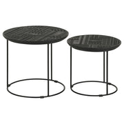 Add a modern rustic touch to your space with this two-piece nesting table set, designed for style and function. Crafted from eco-friendly solid mango wood, the embossed tribal-inspired ink blot pattern on the round tabletops adds a textured global aesthetic. Supported by slim black iron bases with a cage-like silhouette, these tables offer an airy and lightweight feel. Ideal for small spaces, the smaller table conveniently nests under the larger one, making it perfect for versatile living areas. Whether used together or separately, this contemporary set blends organic charm with industrial edge. Key Features: • Two-piece nesting table set crafted from solid eco-friendly mango wood • Embossed tribal-inspired ink blot pattern adds global flair • Slim black iron base with an airy, cage-like silhouette • Space-saving design allows the smaller table to slide under the larger one • Versatile functionality perfect for living rooms, bedrooms, or cozy corners • Blends rustic, industrial, and contemporary aesthetics seamlessly