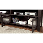 Alma Gray 60" TV Stand, 60"L X 18"W X 24"H, 98.8lbs. This transitional design feature copious open shelf space and dual cabinets allowing you to store away a number of items like movies and games. The large top can accommodate a large TV, and rear wire access ensures everything looks clean. Features: Transitional Gray Glass, Solid Wood, Wood Veneer, Others Daul Cabinet Design 3mm Glass Cabinets & Open Shelves Rear Wiring Access