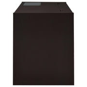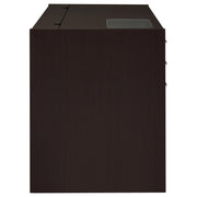 A modular design scheme adds function and personality to a modern task space. This connect-it computer desk conquers basic operations and lends a stylish contemporary look. Finished in bold cappuccino, its linear silver hardware pulls offer a cool touch. Find storage space in three side drawers with Euro glides and a center keyboard drawer that makes computing a snap. Spruce up a compact contemporary office or home space with this exceptional desk. Key Features: • Connect-It office desk in cappuccino finish • Lift-top cord management compartment, a keyboard tray, two (2) storage drawers, and one (1) file cabinet are features of this desk • Clear tempered glass insert on desk offers clear view of devices • Lift-top storage contains power outlet (4AC) • MDF, particle board, and laminate construction