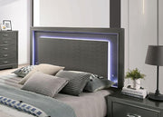 Illuminate any space with this beautiful bedroom set. A strip of LED light is hidden behind the headboard's textured main panel, which results to a visually stunning glow around the rectangular centerpiece. Mysterious and cool at the same time, the light reflects on to each piece of the ensemble, which features a gray finish with a slight sheen. Translucent hardware made of acrylic materials adds to the luminous potential of this dazzling set.