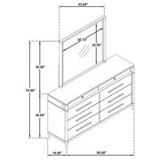 This eight-drawer dresser and mirror set captures contemporary elegance through subtle curves and polished detail. Elongated brushed nickel pulls and sleek metal tube accents highlight the silhouette, while the framed mirror adds dimension and balance. Made from solid rubberwood, engineered wood, and a smooth laminate veneer, the dresser drawers glide on heavy-duty tracks and feature felt-lined top compartments for added refinement. Key Features: • Eight-drawer dresser with framed mirror and soft, contemporary rounded silhouette • White finish pairs with brushed nickel handles and sleek vertical tube accents • Top drawers include felt lining and tinted interiors with dovetail construction • French dovetail front and English dovetail back glide on 45mm metal runners • Constructed from solid rubberwood, engineered wood, and laminate veneer • Mirror attaches securely to dresser; tip-over restraint system included