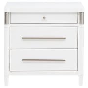 This three-drawer nightstand blends subtle curves with thoughtful convenience. Vertical metal accents and brushed nickel pulls contrast a white finish, while the felt-lined top drawer includes discreet cord access for device charging. Built from solid rubberwood, engineered wood, and a smooth laminate veneer, it offers smooth drawer movement and refined bedside storage in a compact silhouette. Key Features: • Three-drawer nightstand with curved edges and clean profile for modern bedside storage • White finish pairs with brushed nickel pulls and sleek vertical tube accents • Top drawer includes felt lining, tinted interior, and hidden cord access for charging • Drawer boxes feature dovetail joints and glide on 45mm heavy-duty metal runners • Built from solid rubberwood, engineered wood, and smooth laminate veneer • Fully assembled nightstand includes tip-over restraint for dependable bedside use