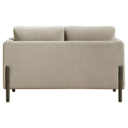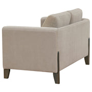 Modern lines and plush comfort come together in this upholstered loveseat, designed for relaxed refinement. A engineered wood frame in a rich coffee finish outlines its recessed panel arms, creating a clean, architectural silhouette. Wrapped in taupe polyester, the seat and back cushions are fully reversible for extended use and lasting comfort. Whether styled alone or with its matching counterparts, this piece offers balance and softness in equal measure. Key Features: • Loveseat features a low-profile design with clean lines and recessed panel arms • Engineered wood frame finished in coffee adds warmth and structured visual contrast • Taupe polyester upholstery offers soft texture and durable everyday use • Reversible seat and back cushions provide flexible comfort and long wear • Plush cushions offer relaxed support while maintaining a tailored look • Complements the matching sofa and chair for a cohesive living room ensemble