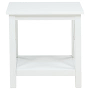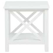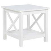 Clean lines and a classic silhouette define this square end table, bringing crisp charm and simple function to any space. An X-frame base adds a touch of farmhouse character, while the open lower shelf offers easy storage or display. Finished in bright white and crafted from solid pine and engineered wood, this accent table adds fresh energy and reliable structure to living rooms or reading corners. Key Features: • Square end table with crisp profile and open shelf for casual everyday storage • White finish adds a clean, airy look ideal for farmhouse or coastal interiors • X-frame sides bring classic detailing and supportive visual interest • Lower shelf offers space for books, baskets, or decorative pieces • Crafted from solid pine and engineered wood for strength and structure • Perfect as a side table, accent table, or occasional table in any room